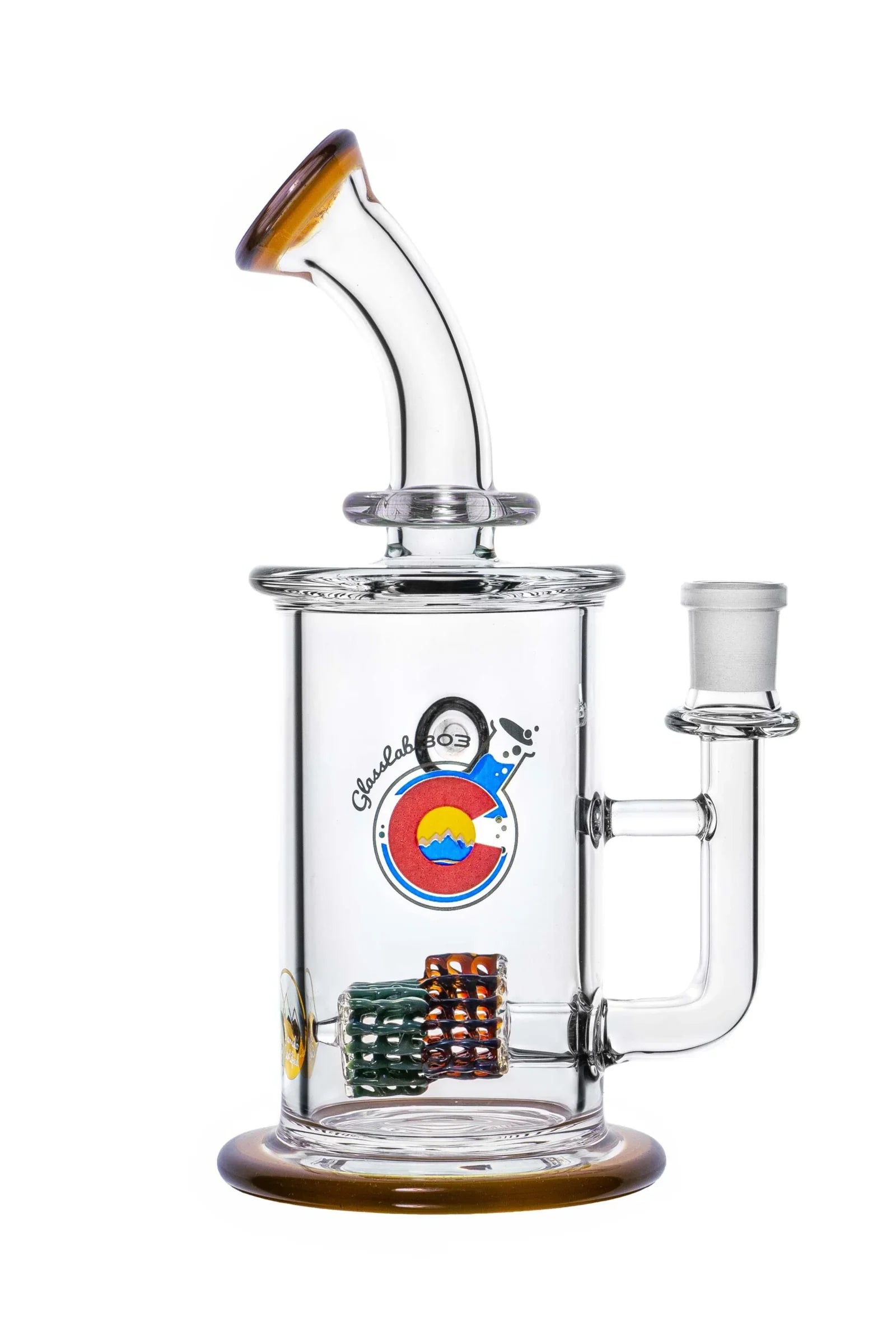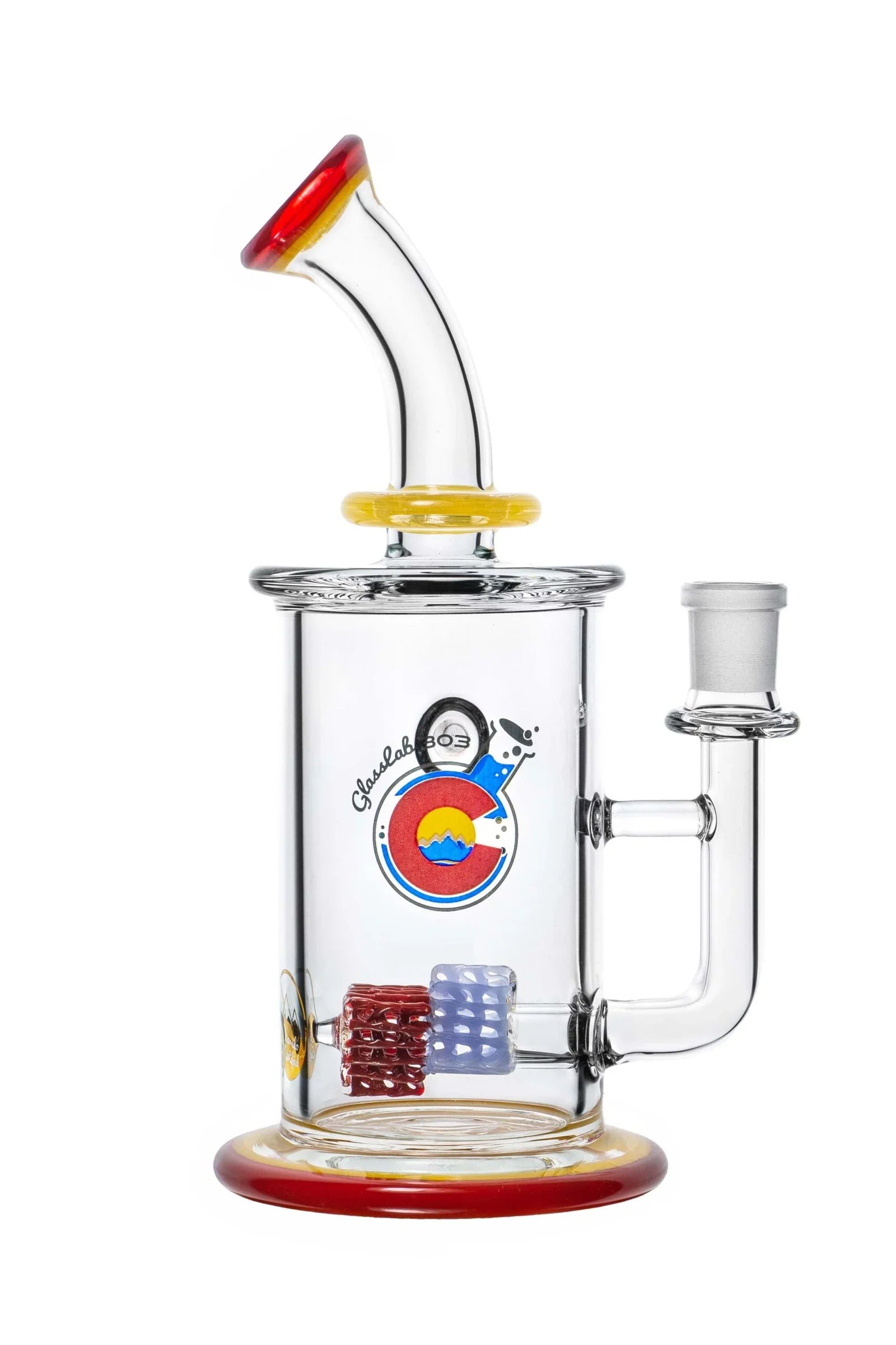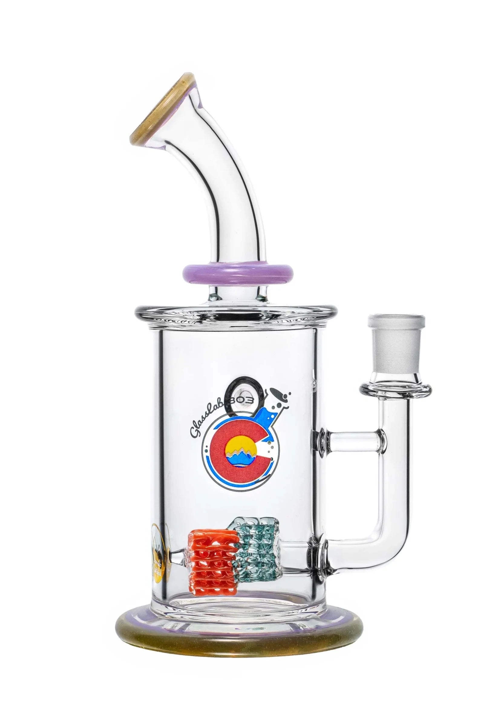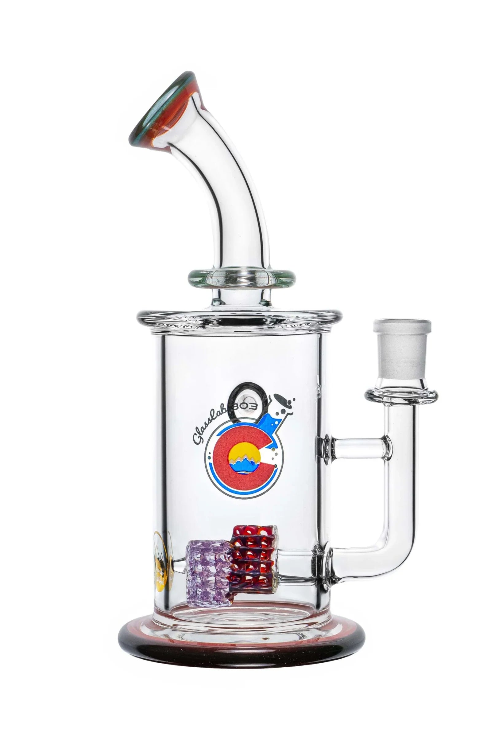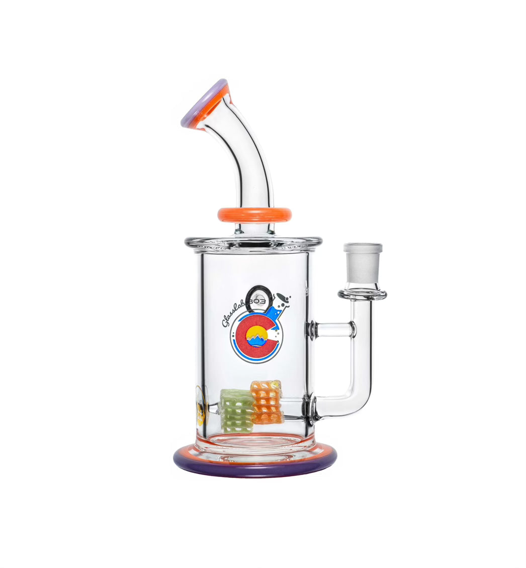 The two-tier lace structure is built using GL303’s signature lace technique, crafted here in a sharp triangular formation and repeated twice within the chamber. Light interacts with the layers to create dimensional shifts and strong geometric highlights. The form is finished with a color lip wrap on both the mouth end and the base, grounding the design with a clean frame.