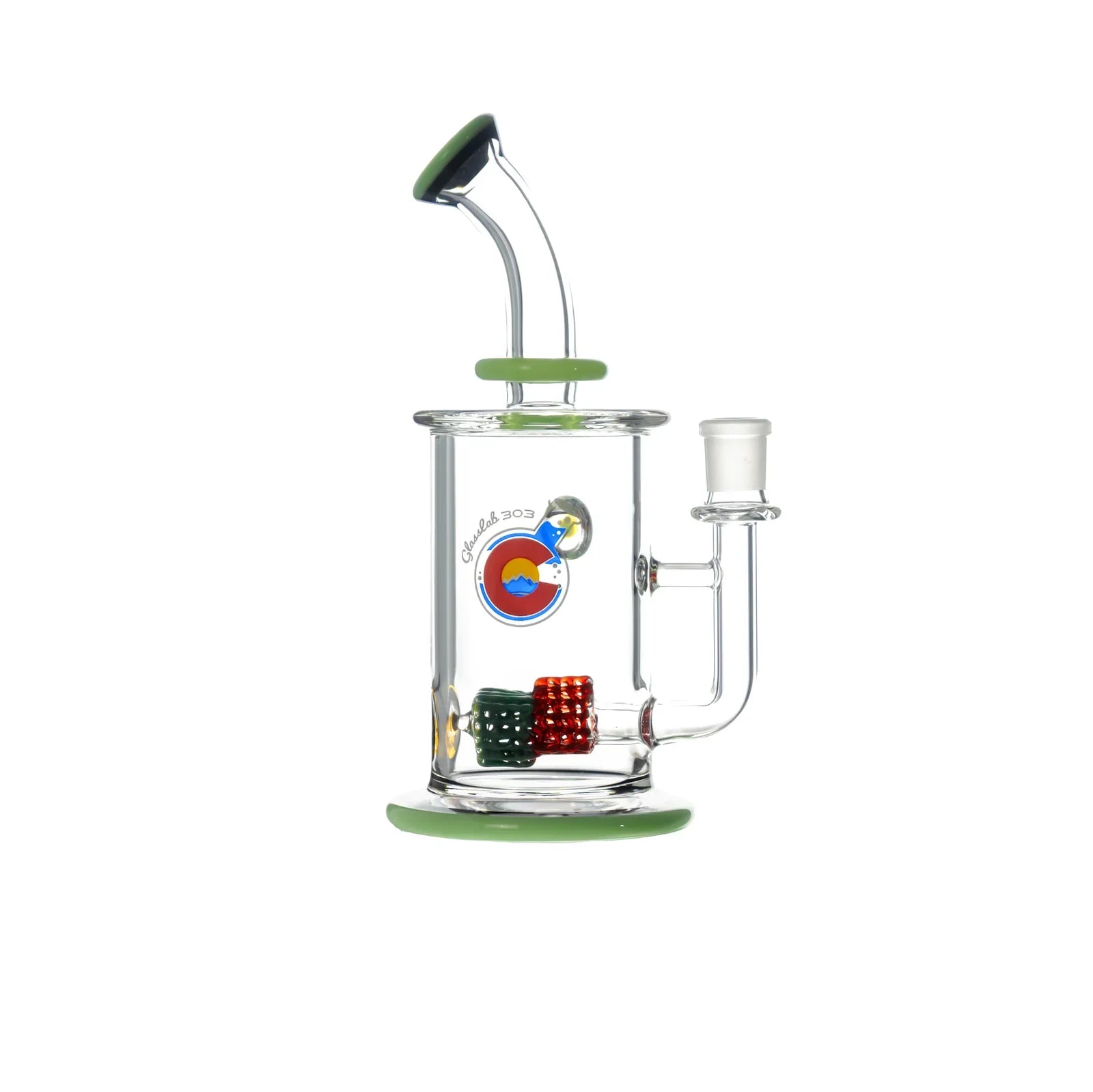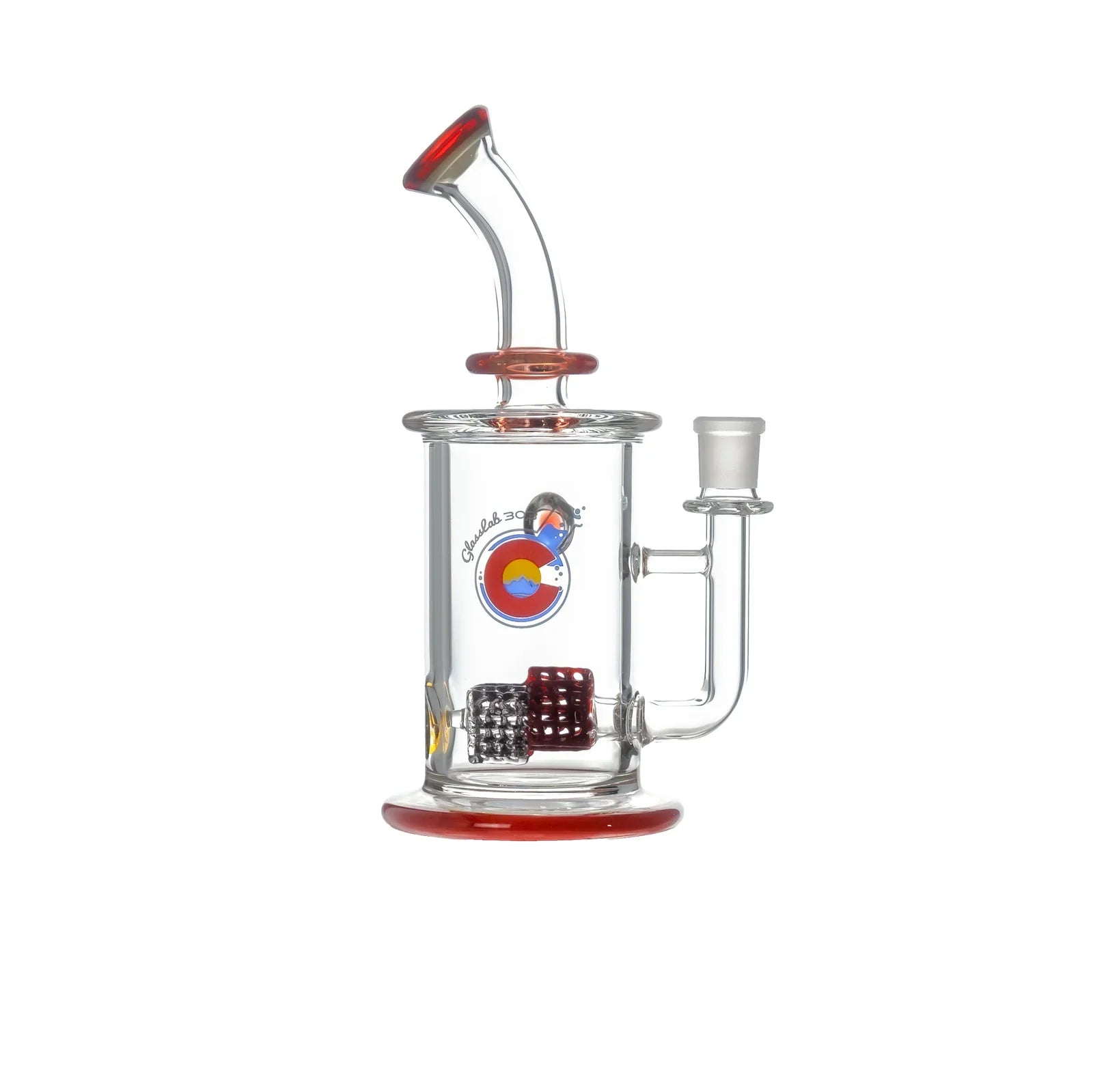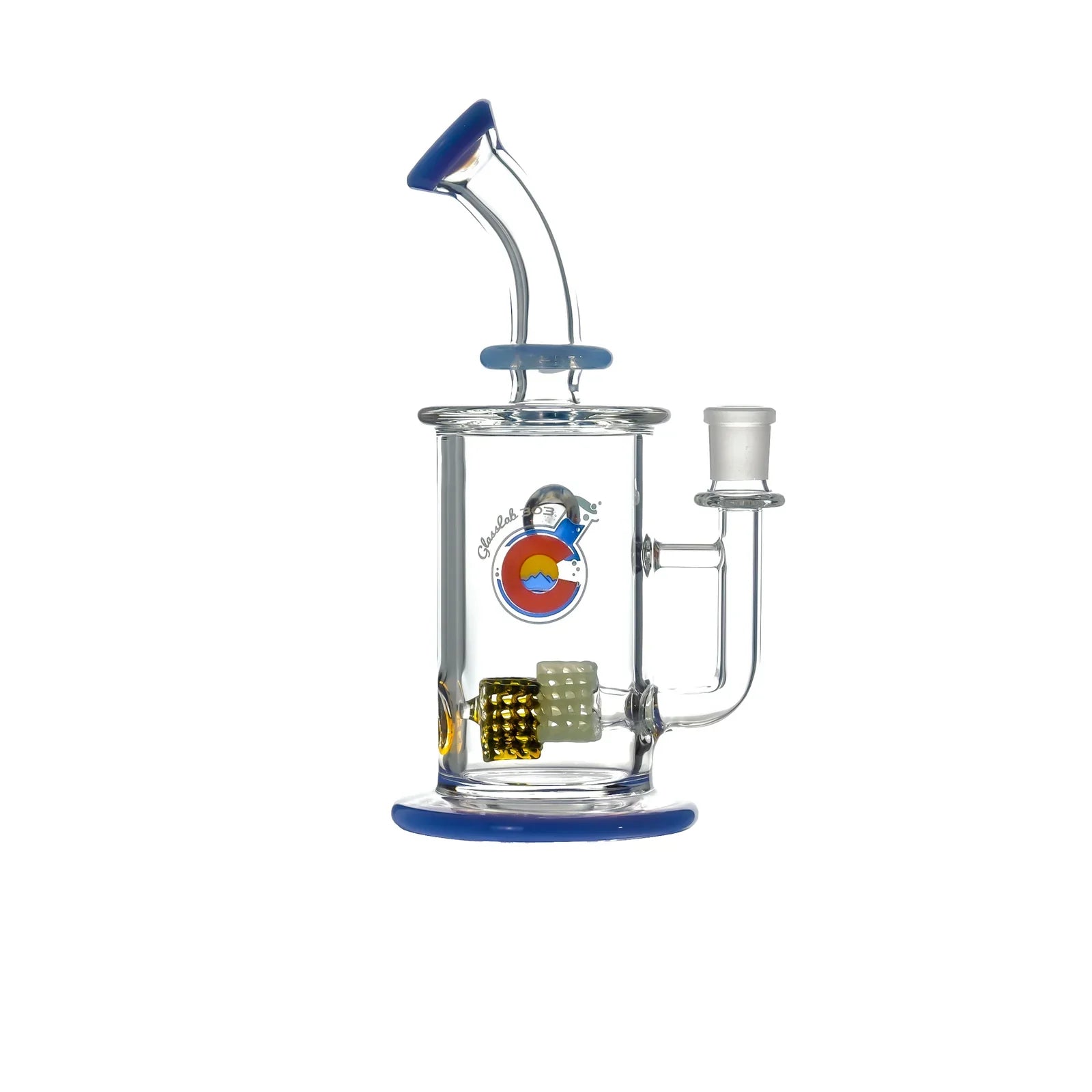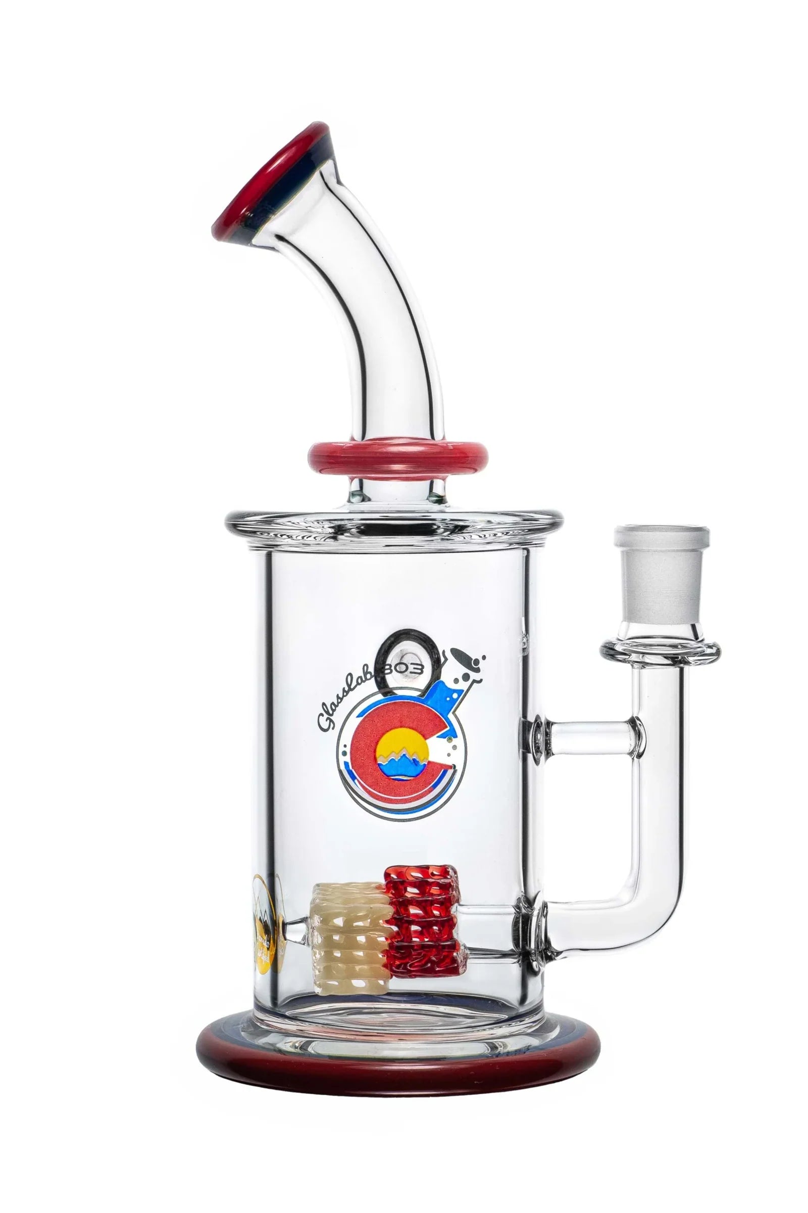 The two-tier lace structure is built using GL303’s signature lace technique, crafted here in a sharp triangular formation and repeated twice within the chamber. Light interacts with the layers to create dimensional shifts and strong geometric highlights. The form is finished with a color lip wrap on both the mouth end and the base, grounding the design with a clean frame.